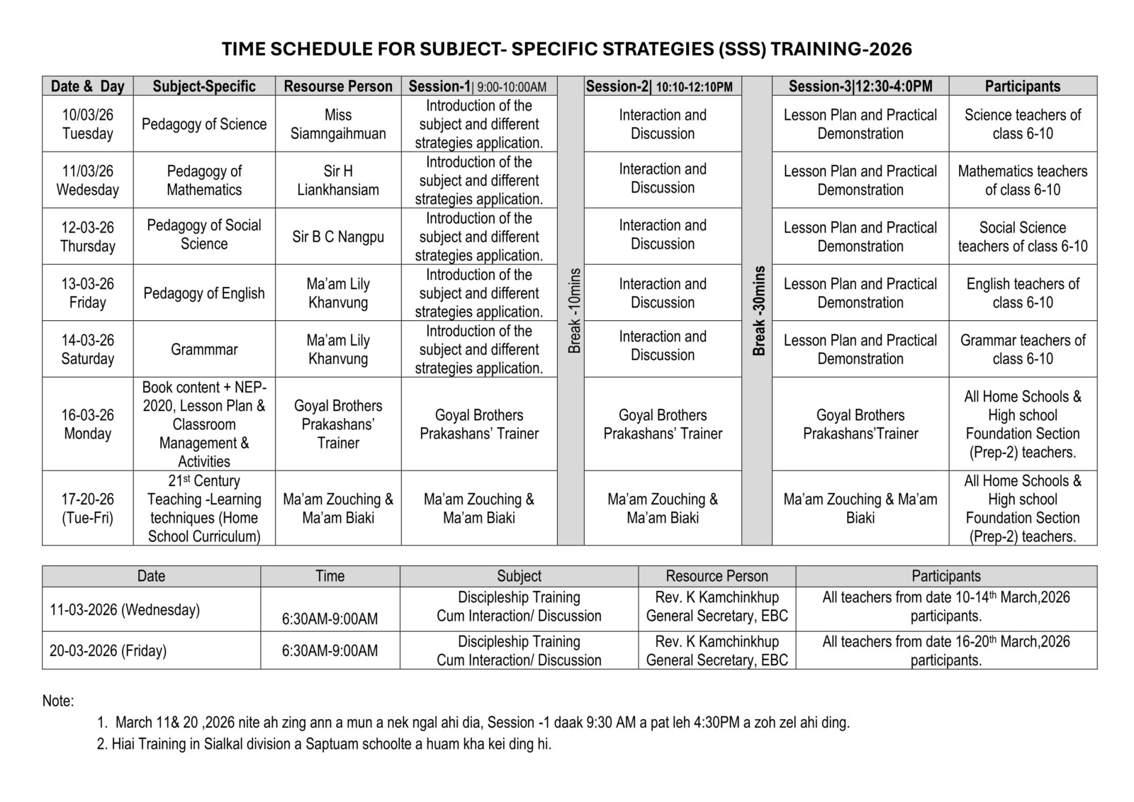 Directorate of Development, EBC nuai a Convention English School Teachers Training Institute (CESTTI) saina in tuni March 10, 2026 akipan March 14, 2026 sung Mini Auditorium, Gospel Centenary Hall ah EBC SCHOOLS TEACHERS’ TRAINING on “SUBJECT SPECIFIC STRATEGIES” program zang uhi.